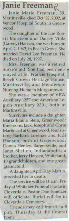 | Survived By | Daughter, Maria Elaina Stein; 3 sons, Jack, Joseph, and Chris Martin; 4 sisters, Barbara Lorenze, Judi Hanson, Donna Henley, and Janet Shelton; brother, Jerry Hanse; 10 grandchildren; one great-grandchild. |
