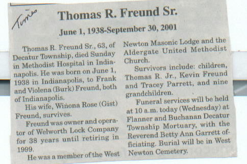 | Survived By | Spouse; children, Thomas R., Jr. and Kevin Freund, and Tracey Parrett; 9 grandchildren. |