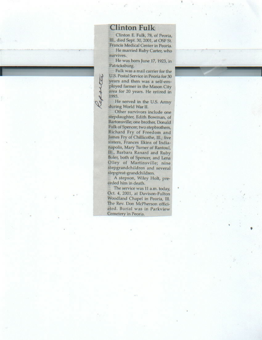 | Survived By | Spouse; brother, Donald Fulk; sisters, Frances Ekins, Mary Turner, Barbara Ranard, Ruby Boler, and Lena Olley; stepdaughter; stepbrother; several step-grandchildren. |