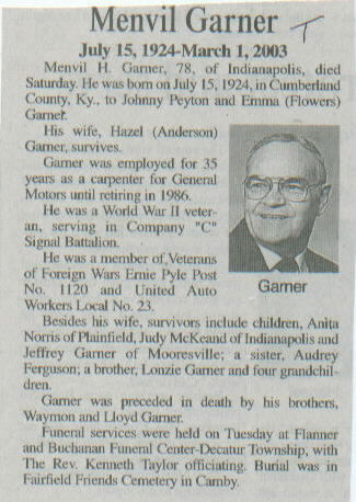 | Survived By | Widow; children, Anita Norris, Judy McKeand, and Jeffrey Garner; sister, Audrey Ferguson; brother, Lonzie Garner; 4 grandchildren. |