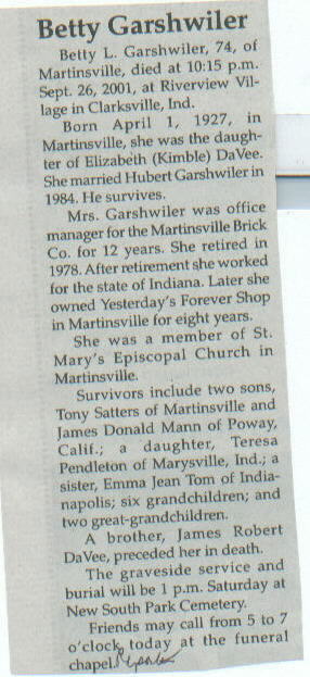 | Other | Age 74. Preceded in death by mother, Elizabeth (Kimble) DaVee; brother, James Robert DaVee. |