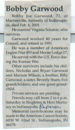 | Survived By | Children, Nicholas and Bryan Garwood, and Mariam Wilson; brother, Billy Garwood; sister, Beverly Sturn; 5 grandchildren; 1 great-grandchild. |