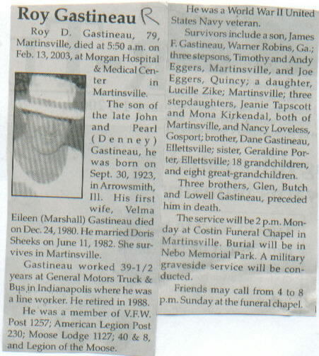 | Survived By | Spouse, Doris; son, James F. Gastineau; stepsons, Timothy, Andy, and Joe Eggers; daughter, Lucille Zike; 3 stepdaughters, Jeanie Tapscott, Mona Kirkendal, and Nancy Loveless; brother, Dane Gastineau; sister, Geraldine Porter; 18 grandchildren; 8 great-grandchildren. |