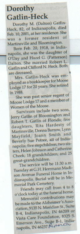 | Survived By | Sons, Jerry and Robert T. Gatlin; daughters, Rita Hardesty, Donna Barrow, Lynn Mayfield, Joann Smith, and Beverly Sue Petree; sisters, Helen Johnson and Catherine Cheek; 5 stepchildren; 18 grandchildren; 25 great-grandchildren. |