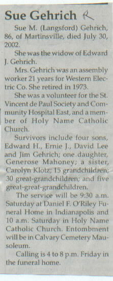 Survived By Four sons, Edward H., Ernie J., David Lee, and Jim Gehrich; daughter, Generose Mahoney; sister, Carolyn Klotz; 15 grandchildren; 30 great-grandchildren; 5 great-great-grandchildren.