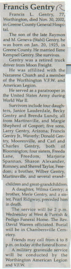 | Survived By | Widow; 4 daughters, Janice Lauderdale, Becky Gentry, Brenda Lundy, and Margie Shepherd; 5 sons, Larry, Francis, Jr., Donald, Carl, and Charles Gentry; 4 sisters, Freeda Lane, Marjorie Spannan, Sharon Alexander Romney, and Sherrell Taylor; brother, Wilber Gentry; several grandchildren and great-grandchildren. |