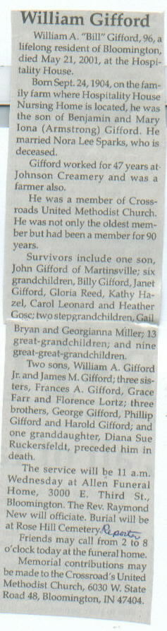 | Other | Preceded in death by spouse; parents, Benjamin and Mary Iona (Armstrong) Gifford; sons, William A. Gifford, Jr. and James M. Gifford; sisters, Frances A. Gifford, Grace Farr, and Florence Lortz; brothers, George, Phillip, and Harold Gifford; granddaughter, Diana Sue Ruckersfeldt. |
