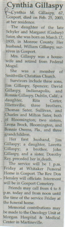 | Survived By | Spouse; 3 sons, Jim, David, and Ronnie Gillaspy; daughter, Rita Carter; 3 brothers, Thomas Sater of Sullivan, and Charles and Milton Sater; 2 sisters, Leona Brock and Bonnie Owens; 3 grandchildren. |