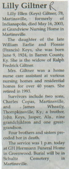 Survived By Two sons, Charles Copas and James Wheatly; brother, John Keys; 9 grandchildren; one great-grandson.