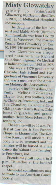 | Survived By | Spouse; daughter, Emily Melissa Glowatcky; 2 brothers, John A. Chandler and Bob Chandler; sister, Kathy Bayne; grandmother, Helen Stone Johnson. |