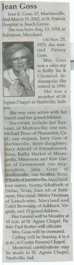 | Survived By | Spouse; son, Michael Truax; stepson, Jerry Goss; 3 daughters, Mary Arnold, Kathy Marker, and Kim Garner; stepdaughter, Jana Gray; brother, Ernie O Keefe; 4 sisters, Norma Schaffrath, Joan Alt, Shirley Hartman, and Carol Browning; 15 grandchildren. |