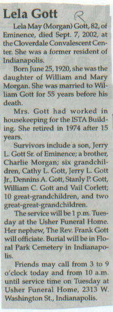 | Survived By | Son, Jerry L. Gott, Sr.; brother, Charlie Morgan; 6 grandchildren; 10 great-grandchildren; 2 great-great-grandchildren. |