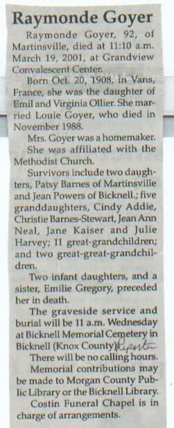 | Other | Preceded in death by spouse; parents, Emil and Virginia Ollie; sister, Emilie Gregory; 2 infant daughters. |