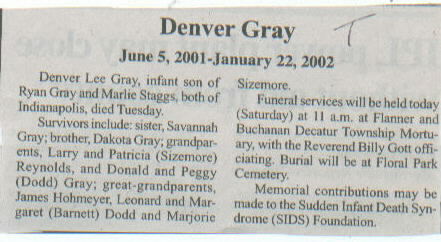 | Survived By | Parents, Ryan Gray and Marlie Staggs; sister, Savannah Gray; brother, Dakota Gray; grandparents, Larry and Patricia (Sizemore) Reynolds, and Donald and Peggy (Dodd) Gray; great-grandparents, James Hohmeyer, Leonard and Margaret (Barnett) Dodd, and Marjorie Sizemore. |