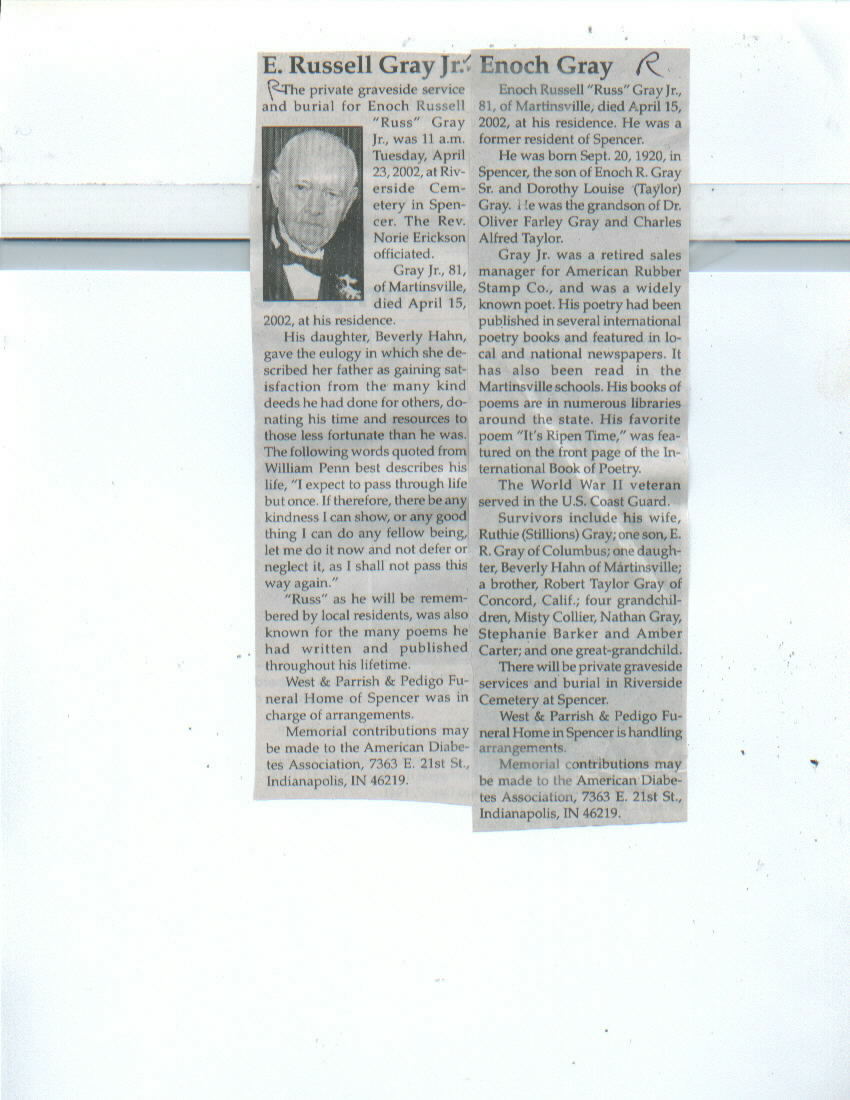 | Survived By | Widow; son, E. R. Gray; daughter, Beverly Hahn; brother, Robert Taylor Gray; 4 grandchildren, Misty Collier, Nathan Gray, Stephanie Barker, and Amber Carter; great-grandchild. |