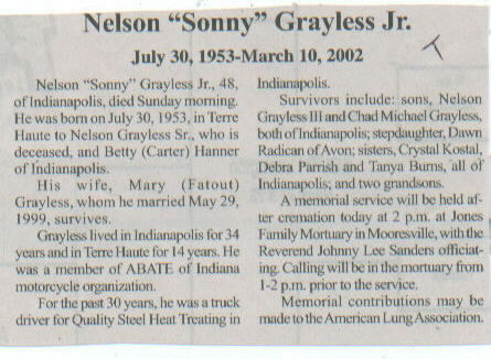 Survived By Widow; sons, Nelson Grayless III and Chad Michael Grayless; stepdaughter, Dawn Radican; sisters, Crystal Kosal, Debra Parris, and Tanya Burns; 2 grandsons.