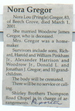 | Survived By | Sons, Richard, Harold, and William Pinkham, Jr., Alexander Harrison, and Woodrow, Jr., Donald L., and Jonathan J. Gregor; 10 grandchildren. |