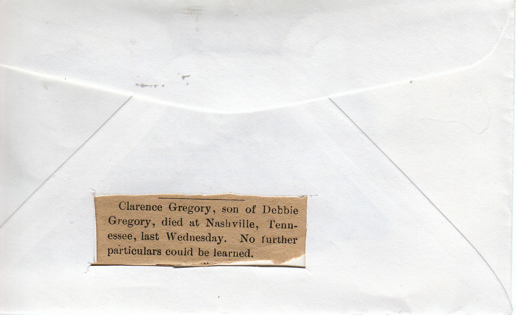 Other Son of Debbie Gregory. Died in Nashville, Tennessee. Buried in Gregory family plot, Mooresville Cemetery.