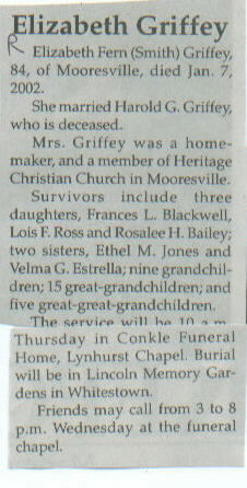 | Survived By | Three daughters, Frances L. Blackwell, Lois F. Ross, and Rosalee H. Bailey; 2 sisters, Ethel M. Jones and Velma G. Estrella; 9 grandchildren; 15 great-grandchildren; 5 great-great-grandchildren. |