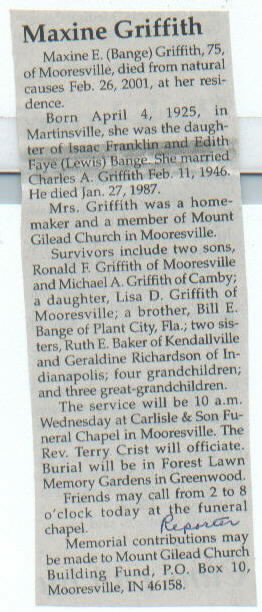 | Survived By | Sons, Ronald F. and Michael A. Griffith; daughter, Lisa D. Griffith; brother, Bill E. Bange; sisters, Ruth E. Baker and Geraldine Richardson; 4 grandchildren; 3 great-grandchildren. |