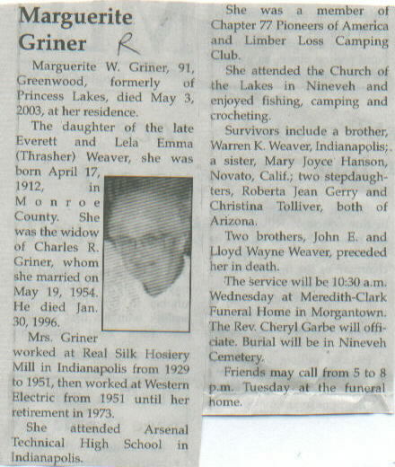| Survived By | Brother, Warren K. Weaver; sister, Mary Joyce Hanson; 2 stepdaughters, Roberta Jean Gerry and Christina Tolliver. |