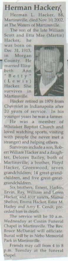 Other Preceded in death by six brothers, Ernest, Harlan, Ervin, Ray, William, and Loren Hacker; and four sisters, Mamie Shelton, Emma Hacker, Ester M. Hatley, and Amy E. Cendt.