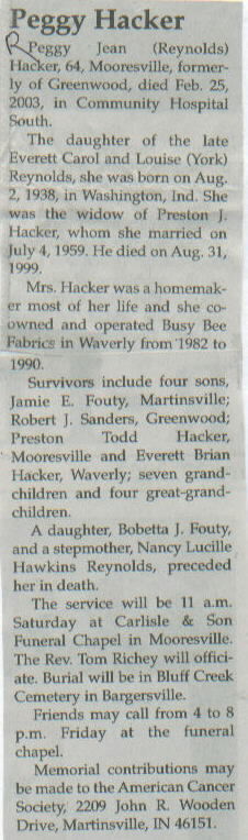 | Other | A daughter, Bobetta J. Fouty, and a stepmother, Nancy Lucille Hawkins Reynolds, preceded her in death. |