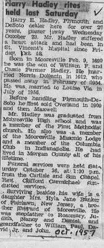 | Other | Age 67. Carlisle Chapel (Rev. Carmichael and Rev. Criswell.) Buried in Hadley family plot, Mooresville Cemetery. Parents: William F. and Cassie Farmer Hadley. First wife died Feb. 1954. |