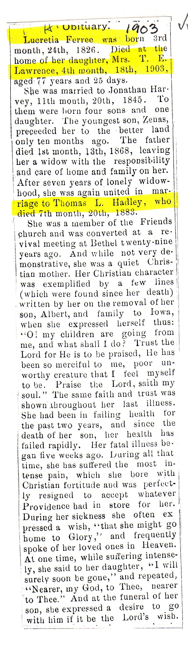 | Other | Age 77 years and 25 days. Died at home of her daughter, Mrs. T.E. Lawrence. Born near Hall. "When her son Zenas died last fall, she moved to Mooresville." |