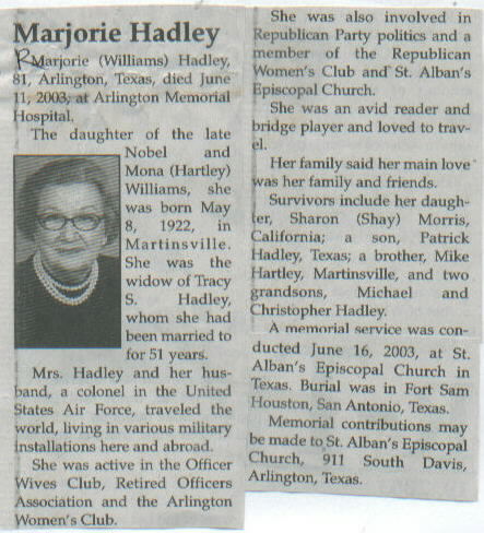 | Survived By | Daughter, Sharon (Shay) Morris; son, Patrick Hadley; brother, Mike Hartley; two grandsons, Michael and Christopher Hadley. |
