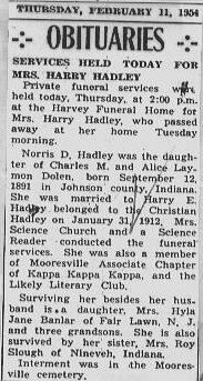 | Other | Age 62. Private funeral at Harvey Funeral Home. Christian Science Reader officiating. Buried in Hadley family plot, Mooresville Cemetery. Parents: Charles M. and Dalice Laymon Dolen. Committed suicide by hanging. |