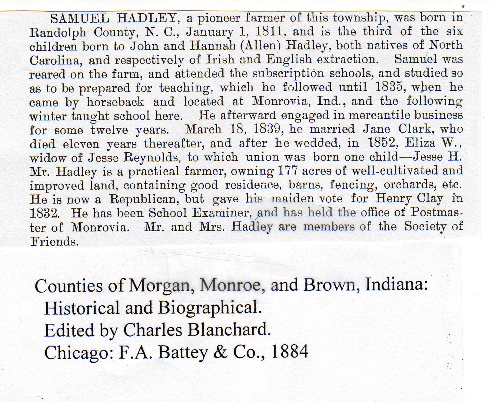 | Other | Age 75 years, 10 months, and 20 days. Born in Randolph Co., N.C. Parents: John and Hannah (Allen) Hadley. Made 3 trips on horseback to Monrovia from North Carolina, where he taught school. On his last trip, he located in Monrovia, in 1835. Married first wife on March 18, 1839; she died 11 years later. In 1852, he married Eliza W., the widow of Jesse Reynolds, to which union was born one child, Jesse H. |
