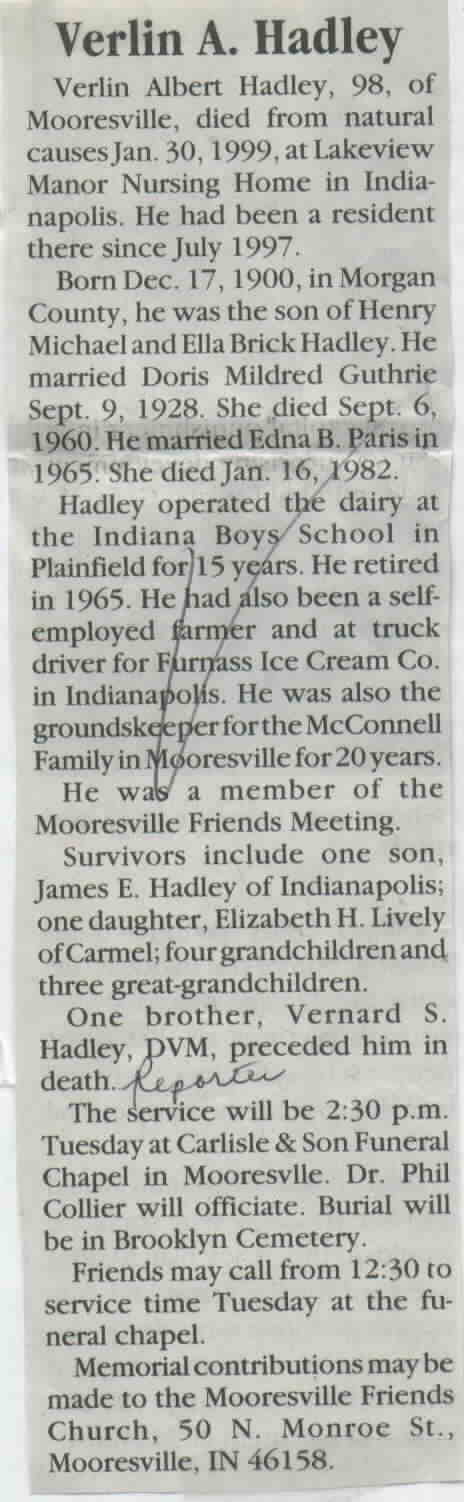 | Other | Age 98. Carlisle Chapel (Dr. Phil Collier.) Buried Brooklyn cemetery. Parents: Henry Michael and Ella Brick Hadley. Ran dairy farm at Boys School for 15 yrs. Truck driver for Furnas Ice Cream; groundskeeper for McConnell family. Died in Indianapolis nursing home. Preceded in death by brother, Vernard S. Hadley, DVM. |