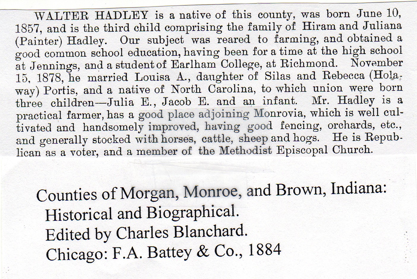 | Other | Age 27 years, 4 months, and 7 days. Parents: Hiram and Julia Ann Anderson Hadley. Preceded in death by mother, who died in 1861; sister Louisa, who died in 1868; and brother Jacob, who died in January 1884. |