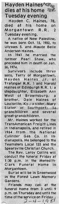 | Survived By | Three sons, Terry, Hayden, Jr., and Harold Haines; stepdaughter, Elizabeth Ann West; brother, Dale Haines; sister, Mary Slater; 14 grandchildren; several great-grandchildren. |