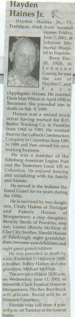 Other Served in the Indiana National Guard for six years during the 1950s. Preceded in death by a son, Frederick S. Haines, in 2000; a brother, Bobby Haines; and one grandson, Michael McVicar.