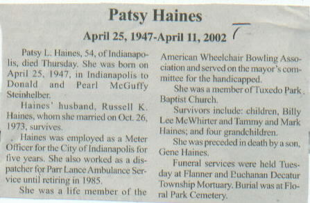 | Survived By | Spouse; children, Billy Lee McWhirter, and Tammy and Mark Haines; 4 grandchildren. |