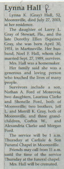 Other Mrs. Hall will be cremated. Parents: Larry L. Gray of Stewart, Fla., and the late Dorothy Ellen (Squires) Gray.