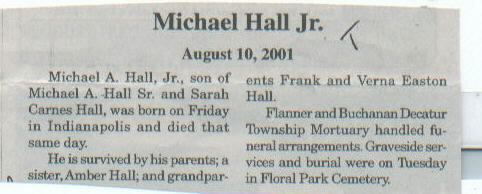 Survived By Parents, Michael A. Hall, Sr. and Sarah Carnes Hall; sister, Amber Hall; grandparents, Frank and Verna Easton Hall.