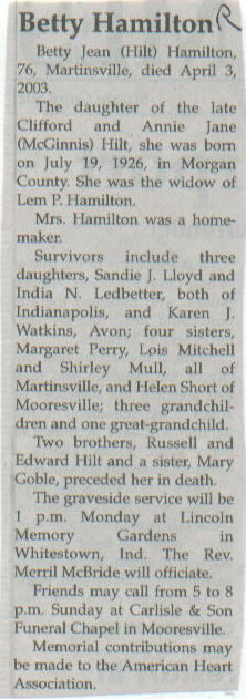 | Survived By | Three daughters, Sandie J. Lloyd, India N. Ledbetter, and Karen J. Watkins; 4 sisters, Margaret Perry, Lois Mitchell, Shirley Mull, and Helen Short; 3 grandchildren; one great-grandchild. |