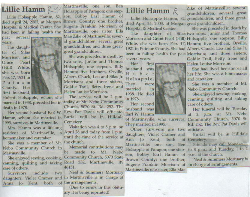 | Other | Preceded in death by two sons, Junior and Thomas Holsapple; one stepson, Billy Hamm; five brothers, Orville, Albert, Chuck, Leo, and Silas, Jr.; and three sisters, Goldie Trail, Betty Irene, and Helen Louise Morrison. Daughter of Silas Morrison and Grace Pearl (Hill) White. |