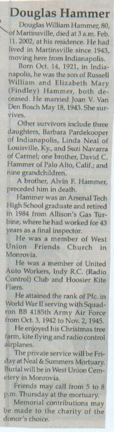 | Other | Son of Russell William and Elizabeth Mary (Findley) Hammer, both deceased. He attained the rank of Pfc. in WW II, serving with Squadron BB, 4185th US Army Air Force, from Oct. 3, 1942 to Nov. 2, 1945. |