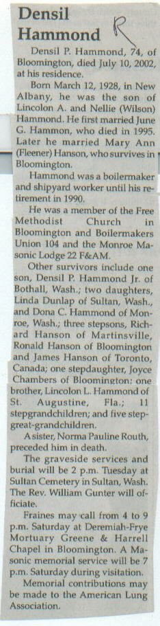 | Survived By | Widow; son, Densil P. Hammond, Jr.; 2 daughters, Linda Dunlap and Dona C. Hammond; 3 stepsons, Richard, Ronald, and James Hanson; stepdaughter, Joyce Chambers; brother, Lincoln L. Hammond; 11 stepgrandchildren; 5 stepgreat-grandchildren. |