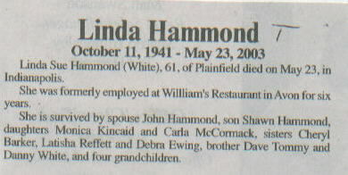 | Survived By | Spouse; son, Shawn Hammond; daughters, Monica Kincaid and Carla McCormack; sisters, Cheryl Barker, Latisha Reffett, and Debra Ewing; brothers, Dave Tommy and Danny White; 4 grandchildren. |