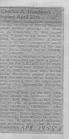 | Survived By | Wife, Ruby; daughters, Mrs. Pearl Houk, Mrs. Dorothy Forsyth, Mrs. Opal Chysinski, and Mrs. Alma Medena; sons, Earl and Ivan Handwork; sister, Mrs. Otis Skinner of Huntington. |