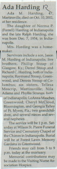 | Survived By | Mother, Norma P. (Farrell) Harding; son, Jason M. Harding; 5 brothers, Philip Stoup, Darrel Stoup, Richard C. Harding, Raymond Stroup, and Dennis Stroup; 6 sisters, Tellesa Moscrip, Nila Adams, Phyllis Strange, LoAnna Mascher, Cheryl McCloud, and Georgia Talley; 2 grandchildren; several nieces and nephews. |