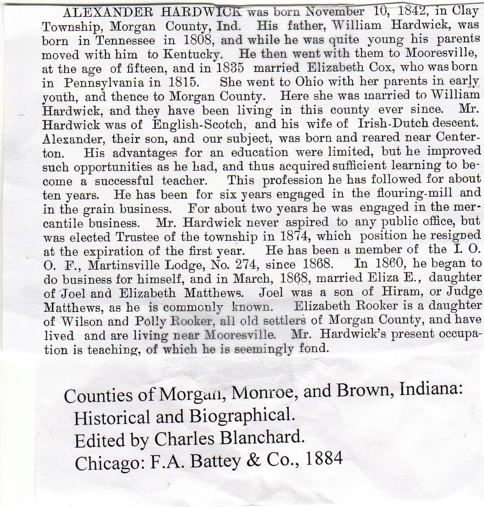 | Other | Age 59. Born in Clay Twp., Morgan Co., Ind. Parents: William and Elizabeth (Cox) Hardwick. Married in March 1868; father of Minnie, W.J., and Pearl H. Had been living in Kokomo at the time of death. |