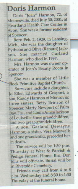 | Other | Preceded in death by spouse; parents, Python and Olive (Ranard) Jackson; son, Garland Dewayne Harmon; sister, Vera Maxwell; 1 grandchild. |