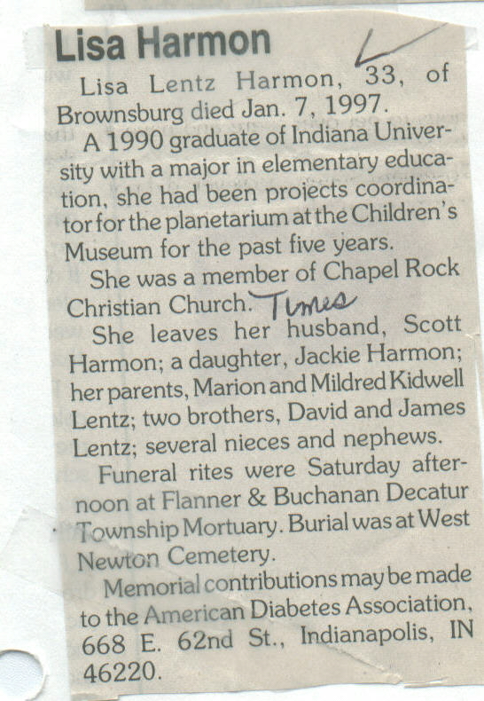 | Other | Age 33. Flanner & Buchanan Decatur Twp. Mortuary. Buried West Newton cemetery. Graduate IU 1990, Elementary education. Director of planetarium, Children's Museum. |