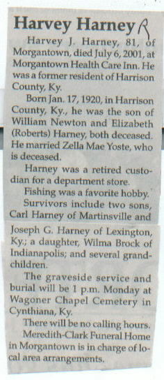 | Survived By | Sons, Carl and Joseph G. Harney; daughter, Wilma Brock; several grandchildren. |
